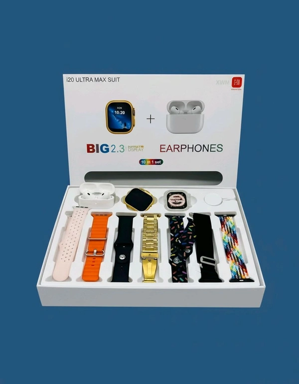 यह I20 Ultra Max Suit स्मार्टवॉच और वायरलेस ईयरफोन का 10-इन-1 कॉम्बो पैक